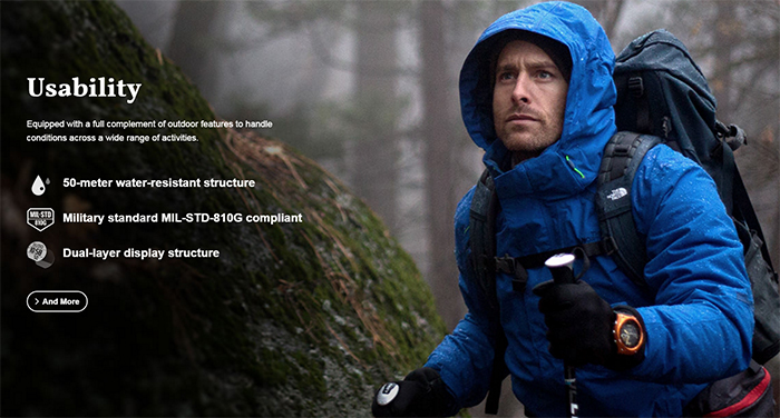 En el apartado de la connectividad este reloj inteligente da la talla; Bluetooth 4.0, y connectividad Wi-Fi. Entre sus características destacan la resistencia al agua hasta 50 metros, sensores como brújula, acelerómetro o barómetro especialmente adaptados para deportes “al aire libre” como trekking, ciclismo, pesca, alpinismo o caza. Tanto es así que este Casio ha sido certificado por el ejército de los Estados Unidos.